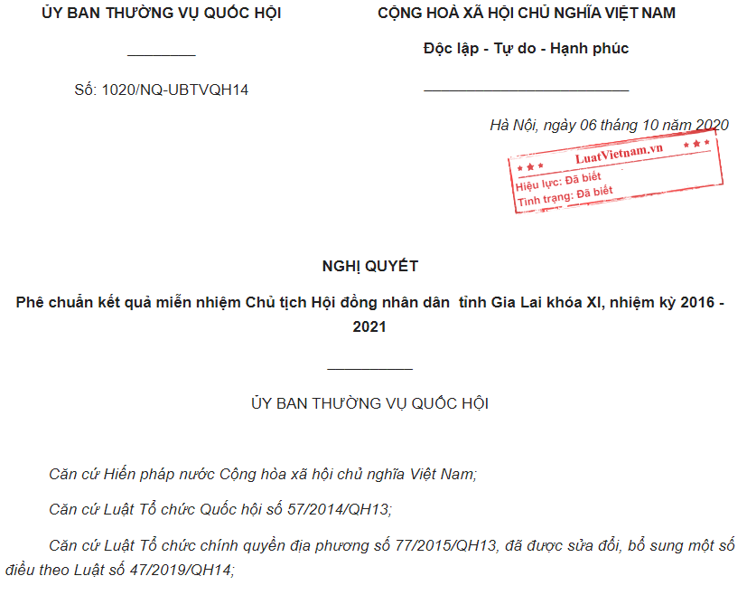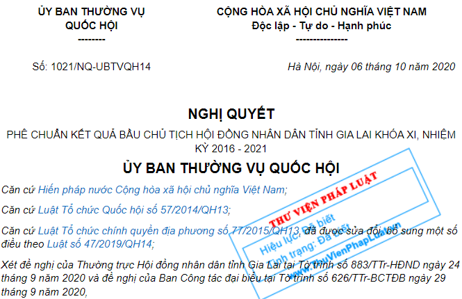 Nghị quyết 1021/NQ-UBTVQH14 KQ bầu Chủ tịch HĐND tỉnh Gia Lai khóa XI