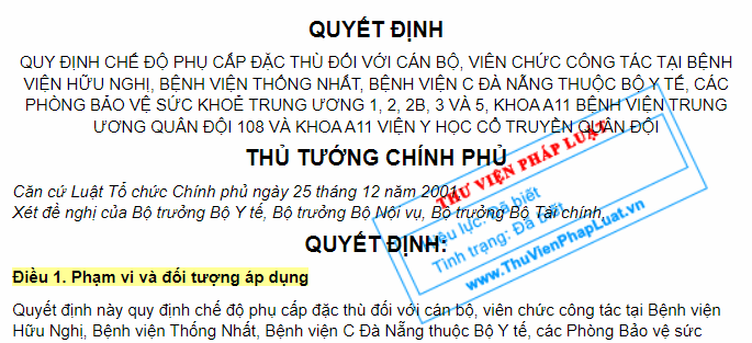 Ngày 18/06/2015, Thủ tướng Chính phủ đã ban hành Quyết định số 20/2015/QĐ-TTg sửa đổi, bổ sung một số điều của Quyết định số 46/2009/QĐ-TTg ngày 31/03/2009 quy định chế độ phụ cấp đặc thù đối với cán bộ, viên chức công tác tại Bệnh viện Hữu nghị, Bệnh viện Thống nhất, Bệnh viện C Đà Nẵng thuộc Bộ Y tế, các Phòng Bảo vệ sức khỏe Trung ương 1, 2, 2B, 3 và 5, khoa A11 Bệnh viện Trung ương Quân đội 108 và Khoa A11 Viện Y học cổ truyền Quân đội.